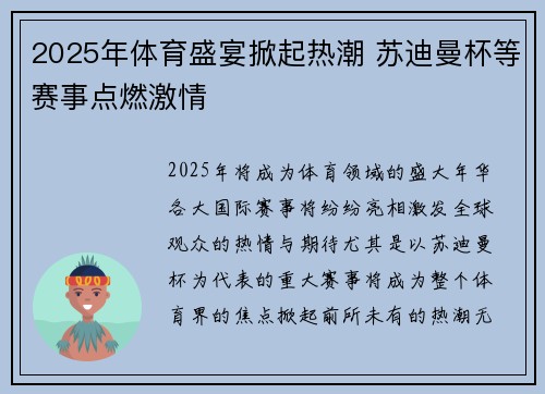 2025年体育盛宴掀起热潮 苏迪曼杯等赛事点燃激情