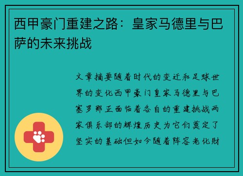 文章摘要:随着时代的变迁和足球世界的变化,西甲豪门皇家马德里与巴塞罗那正面临着各自的重建挑战。两家俱乐部的辉煌历史为它们奠定了坚实的基础,但如今随着阵容老化、财政压力以及竞争日益激烈的环境,它们不得不寻求新一轮的重建。这篇文章将从几个方面分析西甲豪门的重建之路,探讨皇家马德里与巴萨如何在未来的挑战中走出新路,迎接新的胜利。文章将从阵容更新、财务挑战、青训系统、全球化发展等角度,逐一分析这两家俱乐部的未来发展战略。